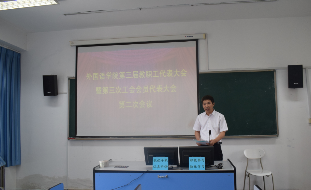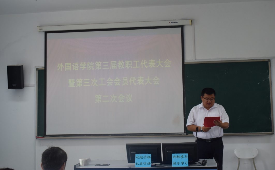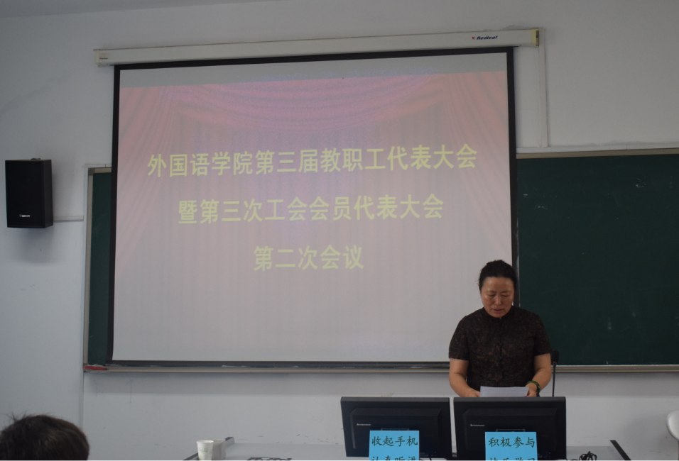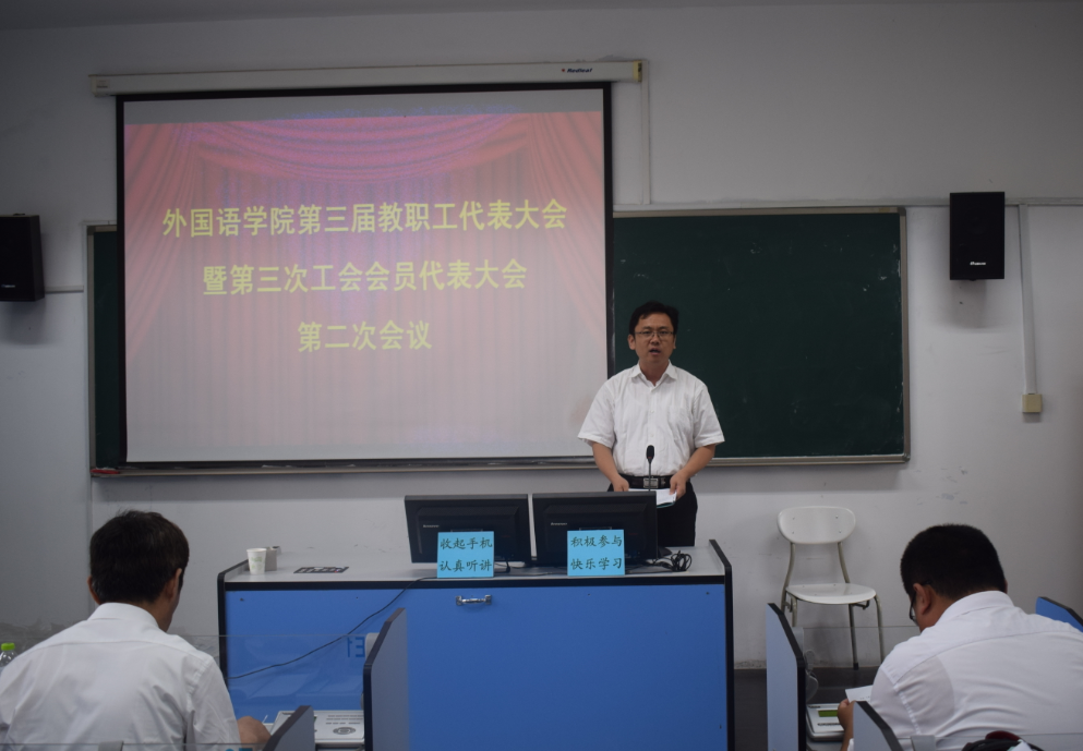 第三届教职工代表大会暨第三次工会会员代表大会第二次会议在418语音室召开,应到代表60人,实到52人。会议由党总支副书记兼副院长宋飞主持。