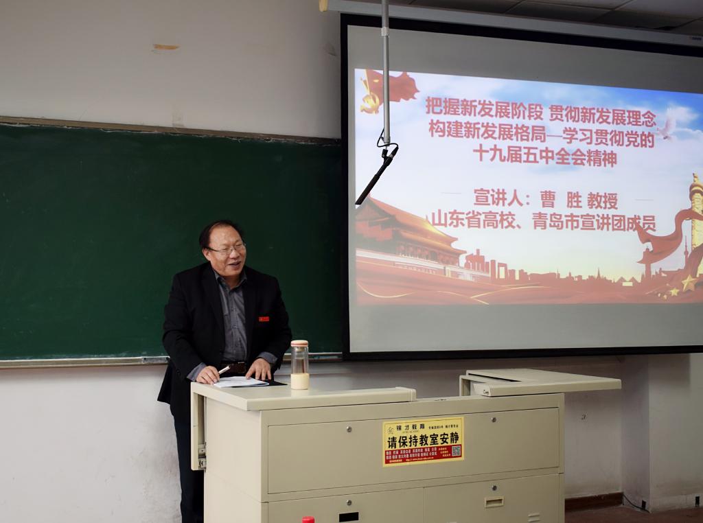 院长曹胜教授为全体青马班学员作了题为《把握新发展阶段 贯彻新发展理念 构建新发展格局——学习贯彻党的十九届五中全会精神》的讲座。曹胜院长用通俗易懂的话语,提纲挈领,深入浅出,从十九届五中全会的主要概况、“十三五”经济社会发展成就回顾、五中全会如何书写大变局下的“中国故事”这三个方面为全体青年马班学员全方位解读党的十九届五中全会精神,并号召更多青年马克思主义者站稳立场、坚定信念、锻炼能力、敢于担当,争做新时代民族复兴大任的追梦者和圆梦人。