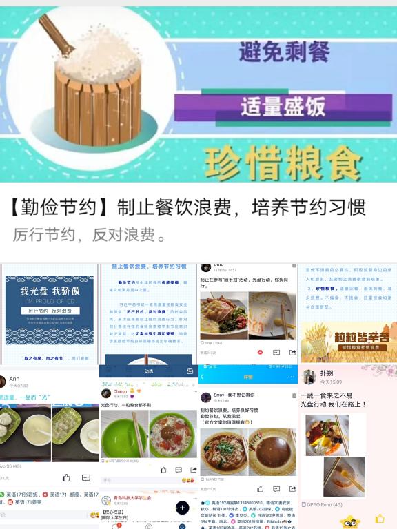 在QQ空间发起互动话题#光盘行动随手拍#,号召同学们参与光盘打卡行动,鼓励同学们晒出“光盘照”、分享“光盘心得”、喊出“光盘宣言”,争做“光盘侠”。