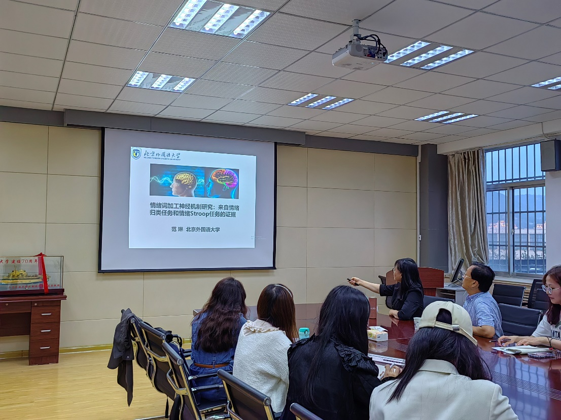 讲座伊始,范琳教授简要阐述了情绪词的相关研究背景,并以情绪词为切入点,详细介绍了利用情绪归类任务和情绪Stroop任务展开的两项情绪词加工神经机制研究。研究一主要考察了注意力和情绪效价对中国学生二语英语情绪词加工的影响,揭示在不同注意力资源调节下二语积极、消极及中性情绪词加工的神经机制。研究二将情绪词进行更加细致的分类,考察注意力资源对情绪直意词和情绪隐含词加工的影响。