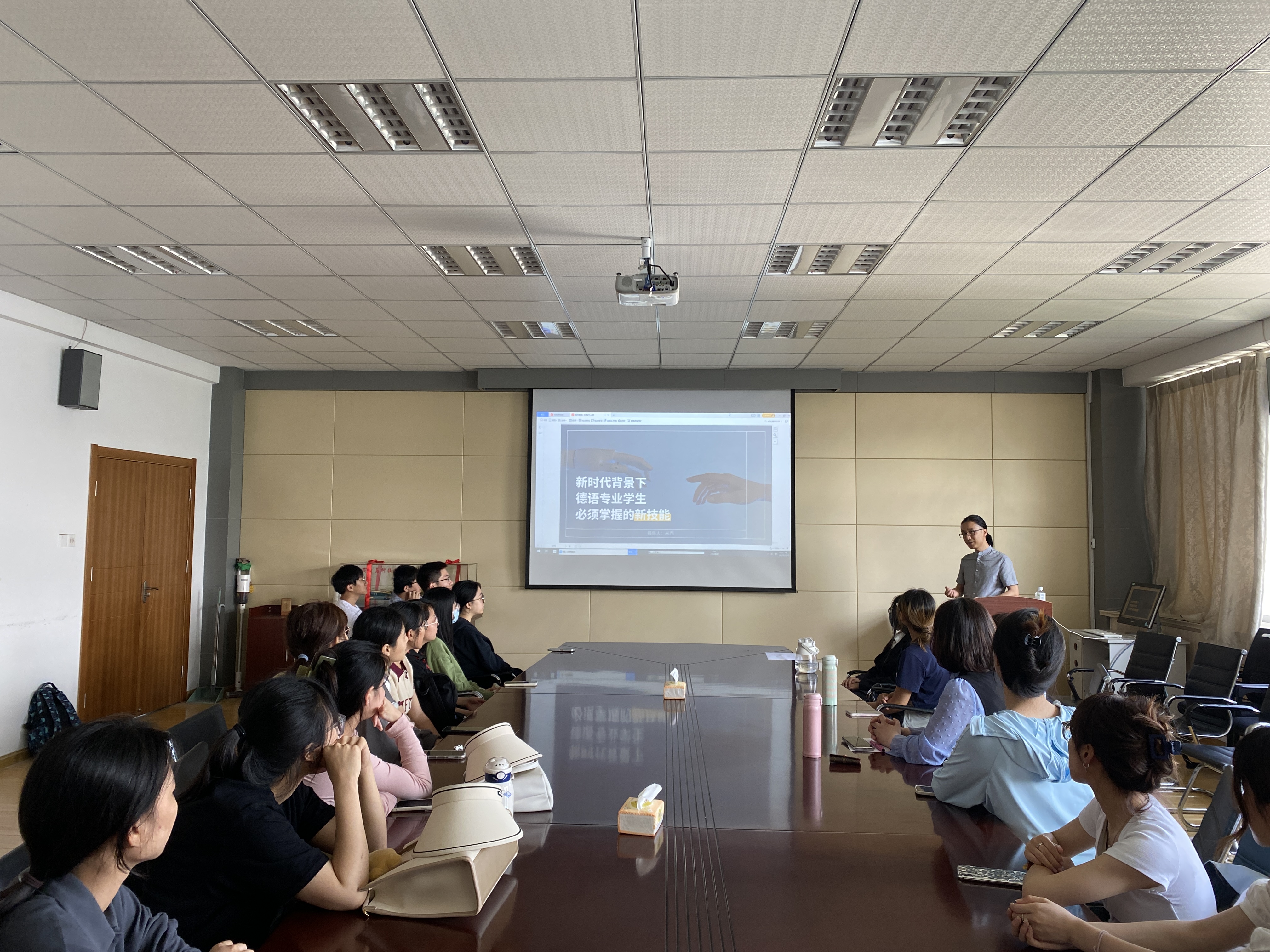 德语专业2009届优秀毕业生李治(网名:米西,知名德语在线教育品牌“米德在线”创始人)返回母校与德语系的学生围绕着“新时代背景下德语专业学生须掌握的新技能”展开了一场别开生面的座谈。李治指出,人工智能的迅猛发展让当代大学生面临着更为严峻的就业挑战。对于德语学生来说,应该重视人工智能技术对于自身学习、就业和创新的影响。AI技术的浪潮中,卓越的求知能力、学习能力、审美能力、实践能力是我们在职场上找到立足之地必须具备的技能。鼓励学生用好社交媒体、主流媒体软件来打造我们外语人自己的简历和名片,米德在线也愿意为同学们提供实习实训的机会。