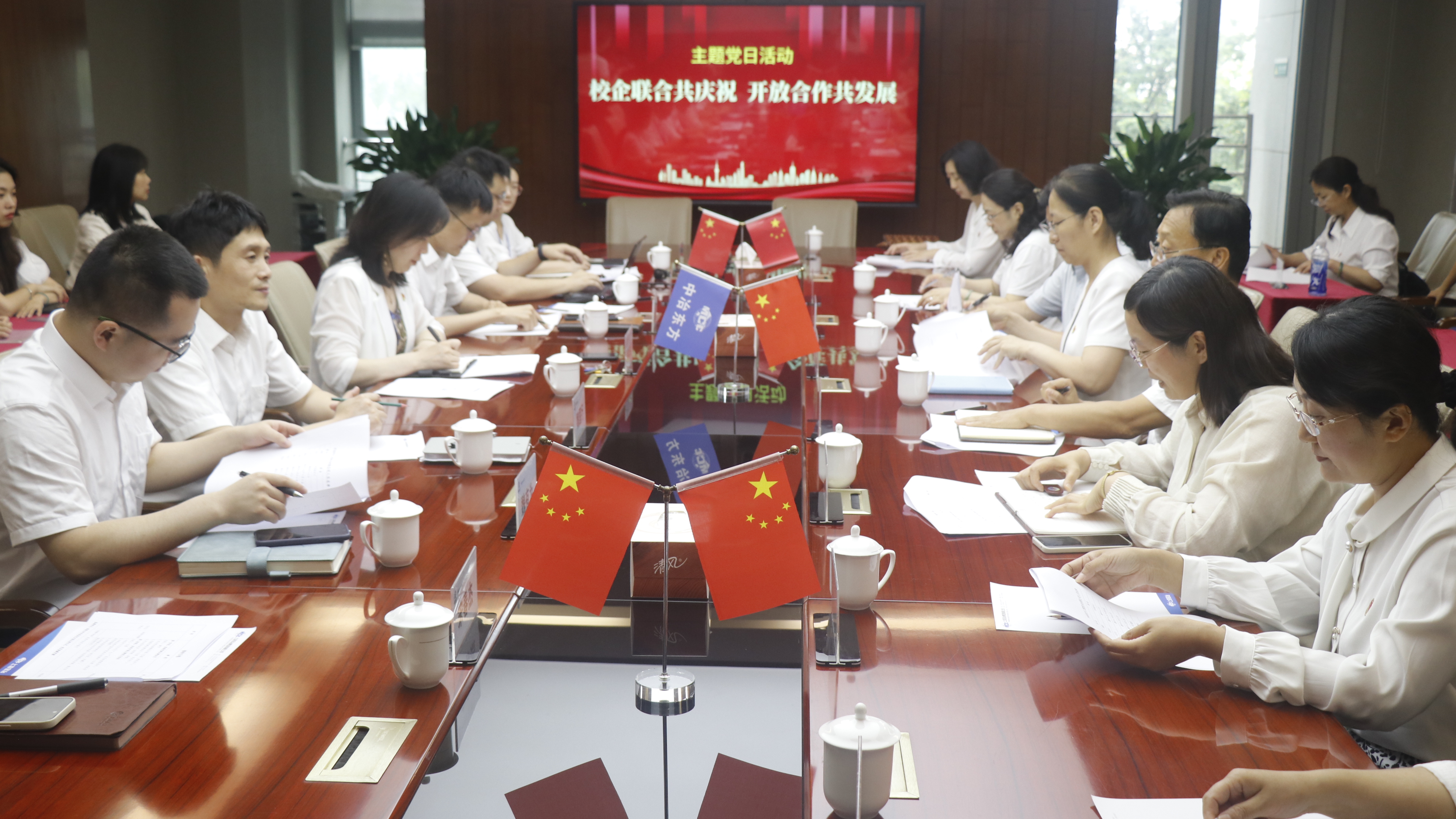 党建共建活动的第二阶段,以“校企联合共庆祝 开放合作共发展”为主题,双方共同开展了主题党日活动。主题党日活动由共同学习、共同庆祝、共同交流和共谋发展四个部分构成。双方共同学习习近平总书记在“七一”前夕对党的建设和组织工作作出的重要指示,共同举行了中国共产党成立102周年庆祝仪式。在共同交流环节,双方进行优势和特色的交流,李玉良教授分享了翻译研究心得,翻译中心项目主管肖潇分享了翻译中心的实践经验,并在活动现场展示了翻译中心取得的部分成就。在共谋发展环节,MTI教育中心主任房钰对双方前期合作的基本情况进行了汇报,与会人员充分自由交流,在人才联合培养、资源校企共享、项目合作共赢、联手社会服务等方面形成新的合作共识。