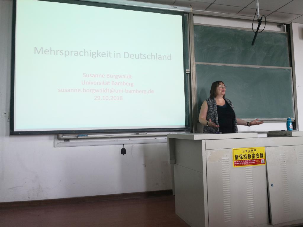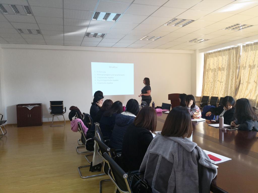 进行了为期一周的访学,期间共举办了三场学术报告,主题分别为《德国的多语化(Mehrsprachigkeit in Deutschland)》、《德语构词法之复合词(Wortbildung-Komposition)》和《二语习得研究心得(L2-Erwerb)》,并围绕《多语化和第三语教学(Mehrsprachigkeits- und Tertiärsprachendidaktik)》这一主题开展了为期三天的教师培训,滨海湾金沙赌场