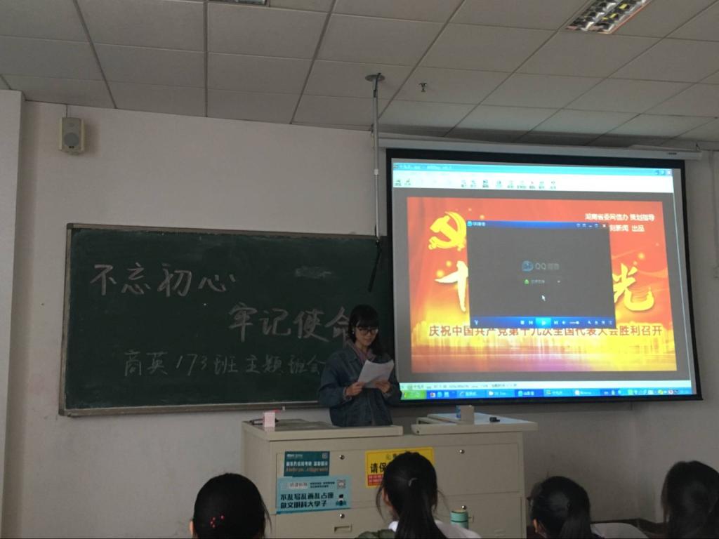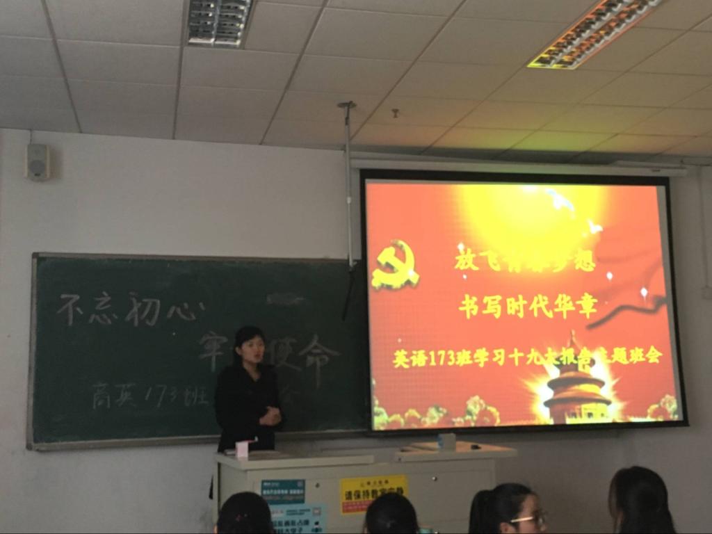 为深入学习宣传贯彻党的十九大精神,11月16日下午英语173班在明307召开了学习十九大精神专题班会。班主任于秀老师及班级全体同学参加了本次班会。