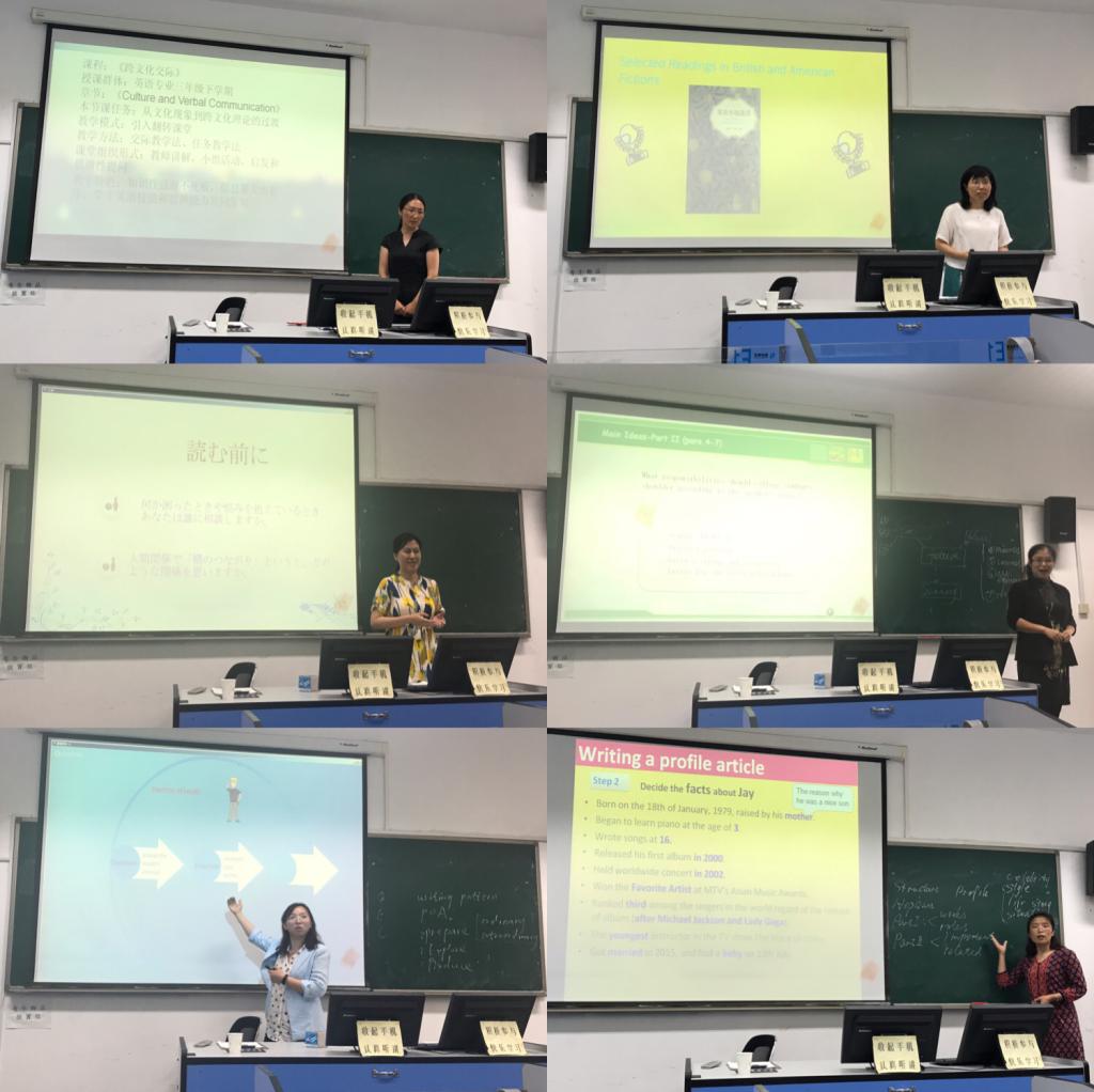 教学督导员担任评委工作。首先参赛教师陈超、刘昱君、杨晓梅、王丽、王宁、孟靖分别展示了15分钟的课堂教学环节。每位教师的教学设计都充满新意,均采用当下主流教学方法;课件制作精美,不仅有图片文字展示,还辅助以视频,动画等多媒体手段;授课语言优美,教态大方;授课过程互动性强,时刻吸引听众的注意力;整个授课过程流畅自然,从中不难看出每一位参赛教师课下的精心准备,真正体现了台上一分钟,台下十年功。