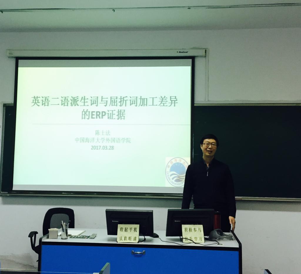 陈教授通过对比分析受试加工英语二语派生词和屈折词诱发的脑电减去其相应的词基诱发的脑电后的差异波,解释了中级水平的中国英语学习者加工两类复杂词的差异。通过脑电数据分析,陈教授发现两类复杂词主要在N200、P300和N700三个ERP成分上存在着词类主效应,但是不存在词基频率主效应。陈教授结合三个ERP成份的功能,给大家讲解了受试加工两类复杂词时的具体差异:二者在词缀加工、表征方式、范畴识别和具体性以及后期加工方面存在着显著的量的差异。通过以上对比分析,陈教授认为中国英语学习者使用了不同的神经机制加工英语二语的派生词和屈折词,词基频率没有影响了两类复杂词的加工。