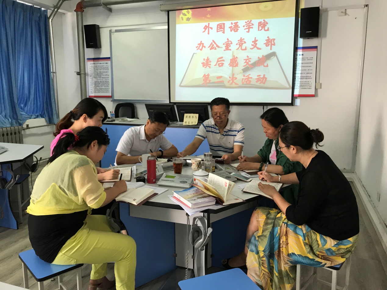 5月27日上午,办公室党支部在语音室407召开支部党员会议并举办第二次读书交流活动。会议由支部书记宋丽超主持,新转入支部的康宁同志及支部全体党员参加。