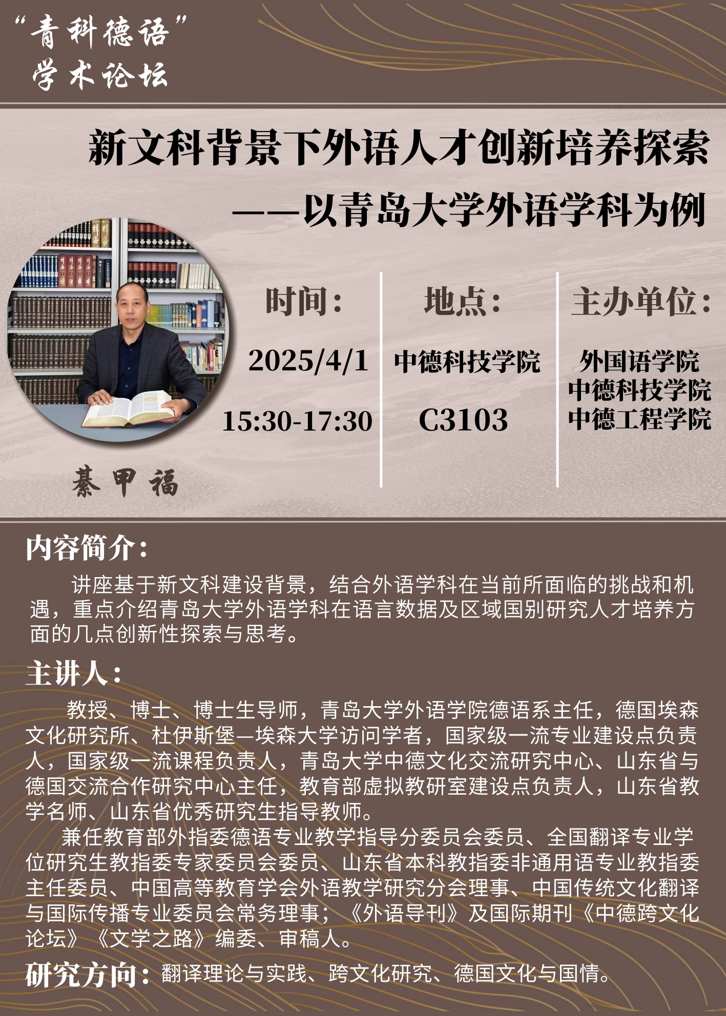 内容简介:讲座基于新文科建设背景,结合外语学科在当前所面临的挑战和机遇,重点介绍青岛大学外语学科在语言数据及区域国别研究人才培养方面的几点创新性探索与思考。