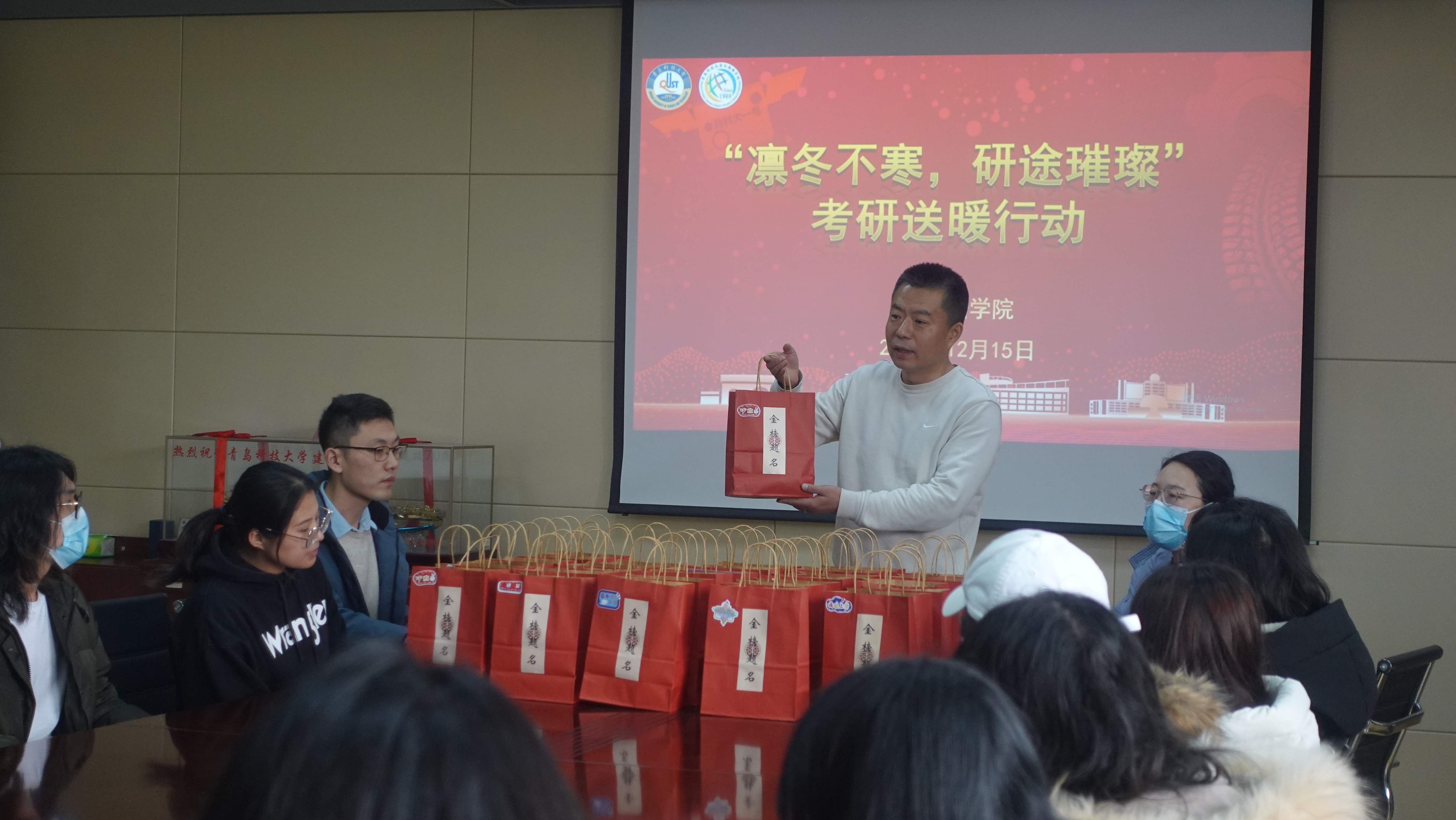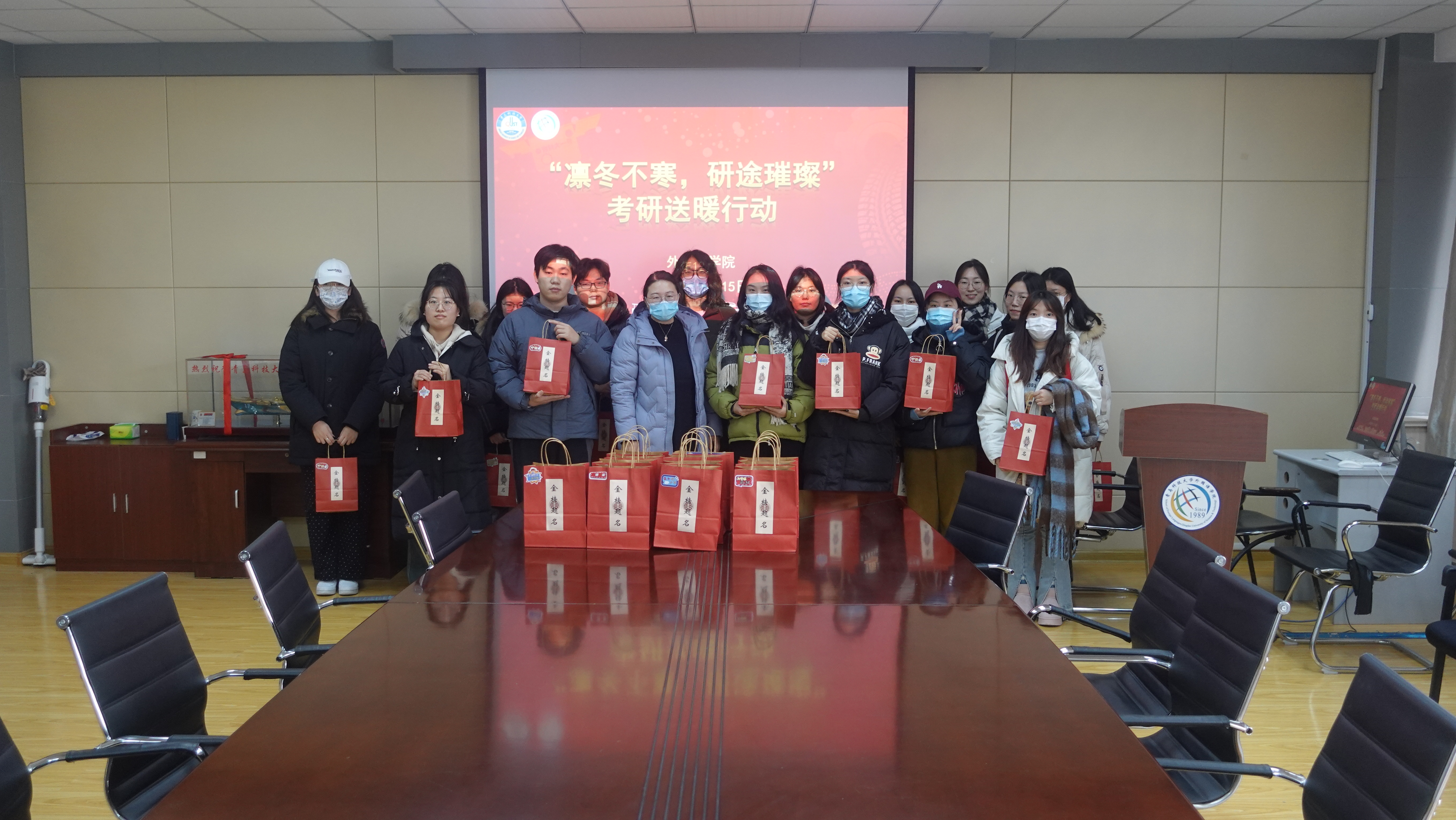 党委副书记兼副院长刘尧老师和辅导员老师们在517室为考研学子送上冬日的温暖祝福和亲切关怀。