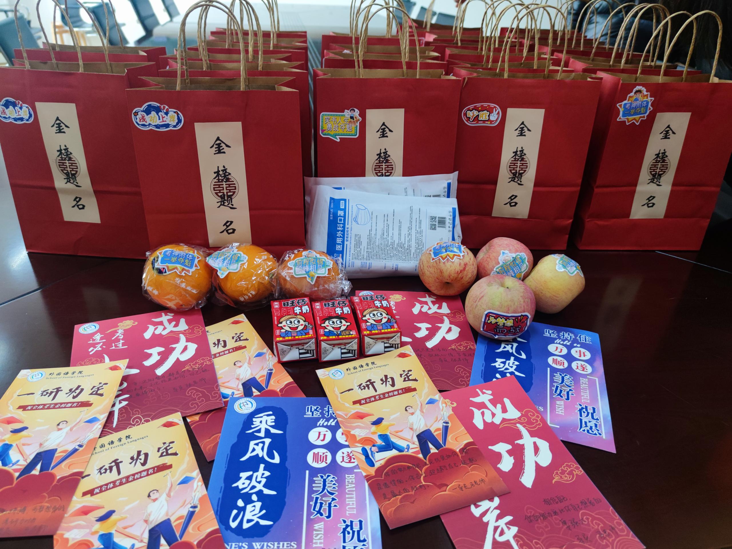 师生为即将踏上考场的同学们送上精心准备、专属定制的考研助力加油包:辅导员老师亲笔手写加油卡片、新鲜水果、零食、口罩……