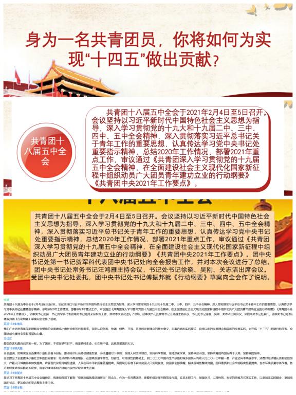 各基层团支部纷纷开展深入学习贯彻共青团十八届五中全会精神学习活动,组织全体团员青年深入学习、热烈讨论全会精神。通过腾讯会议等途径,开展多种形式的组织学习讨论,加深对全会精神的理解把握。多途径、多形式的学习方式实现广大团员青年全会精神学习的全覆盖。青年学生纷纷表示,要珍惜时光,学好本领,鼓足干劲,为中国特色社会主义航船继续乘风破浪积蓄力量,用青春书写无愧于时代的华彩篇章。
