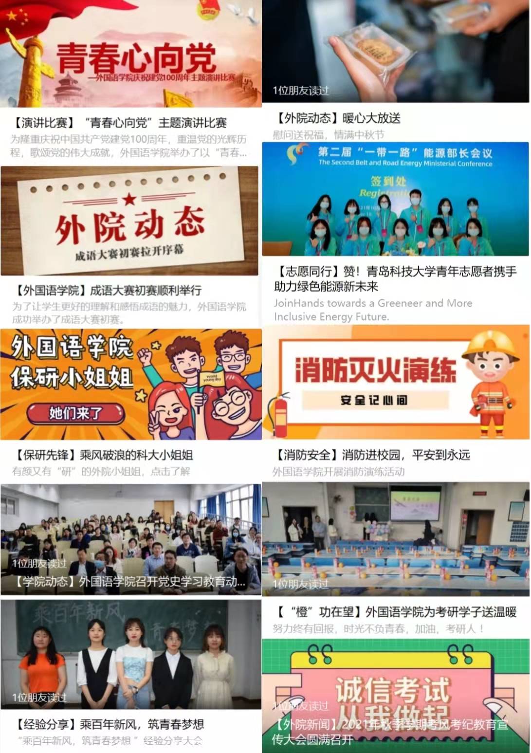 这一年,我们在中秋佳节、考研前夕为外院学子送上暖心祝福;这一年,我们开展了“青春心向党”演讲比赛、党史学习教育动员大会、消防演练、成语大赛等活动,不忘初心、高歌赞党,活动丰富、精彩纷呈;这一年,青科志愿者无私奉献,为“一带一路”贡献青科大力量。保研成功的国奖获得者李奥婕等同学慷慨畅谈,助力外院学子成长成才。这是奋斗向上的一年,这是收获颇丰的一年!2021,我们共同努力,共同欢笑。2022年,愿外院学生活动与时俱进,创新发展;愿外院学子拼搏不懈,再创辉煌!