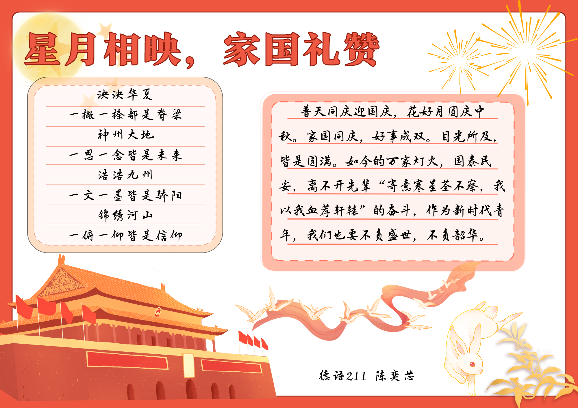 开展“喜迎国庆 青春向党”文艺作品征集活动。通过文艺作品传达爱国主义精神,强调国家的团结和统一,培养了外院学子对国家的热爱和忧国忧民的情感。