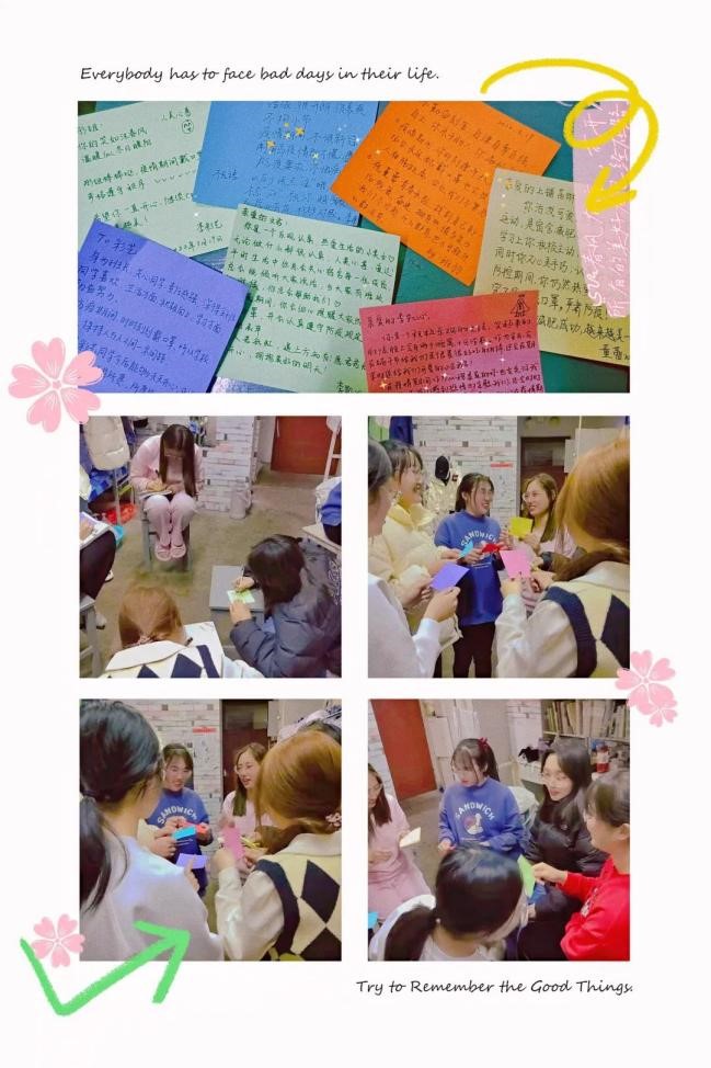 最温暖人心的莫过于陪伴。时当四月,不知你是在为春意融融而欢呼雀跃,还是为疫情形势的严峻复杂而担忧?不管答案如何,反复的疫情让室友之间的联系更为紧密。积极的自我介绍,谈谈疫情防控期间的感想和体会,书写赞美卡……各个宿舍团坐在一起谱写了一曲曲“以爱之名”心理健康教育连续曲。(英语214班宿舍)